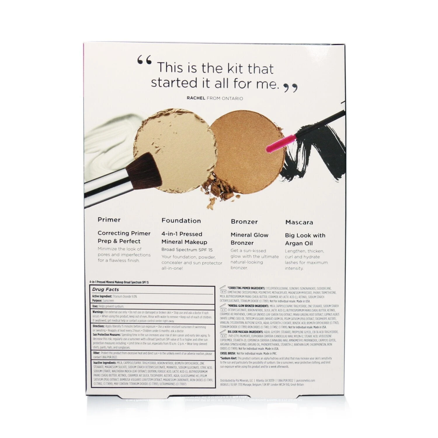 Best Sellers Kit (5 Piece Beauty To Go Collection) – # Light: 1x Correcting Primer – Prep & Perfect 10ml/0.3oz 1x 4 in 1 Pressed Mineral Makeup Broad Spectrum SPF 15 – # Light, 4.3g/0.15oz 1x Mineral Glow Bronzer 3.4g/0.12oz 1x Big Look Mascara (Black) 5g/0.17oz 1x Chisel Brush Ideal both for personal use & as a gift